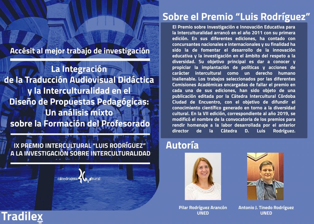 Dr. Pilar Rodríguez Arancón and researcher Antonio Jesús Tinedo Rodríguez have been awarded an honorable mention for the best research work in the field of interculturality. This recognition is granted in light of their research titled “The Integration of Didactic Audiovisual Translation and Interculturality in the Design of Pedagogical Proposals: A Mixed Analysis on Teacher Training,” which has been distinguished with the XI “Luis Rodríguez” Award for research on interculturality.